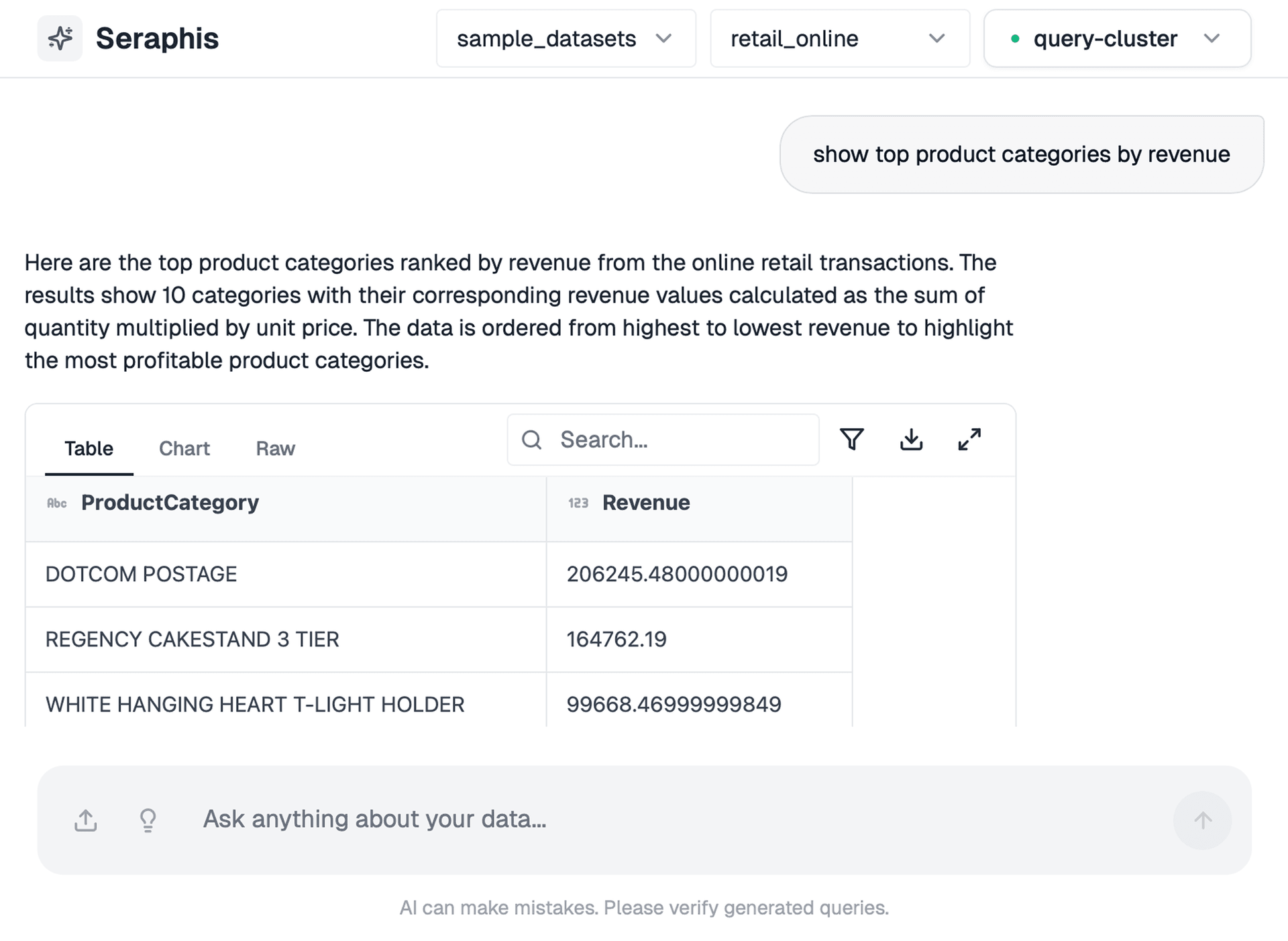 Reduce the "Time to Insight" from hours to seconds. Whether you need a quick summary table or a complex trend visualization, Seraphis generates accurate results instantly. This speed allows your team to focus on strategy and execution rather than data preparation.