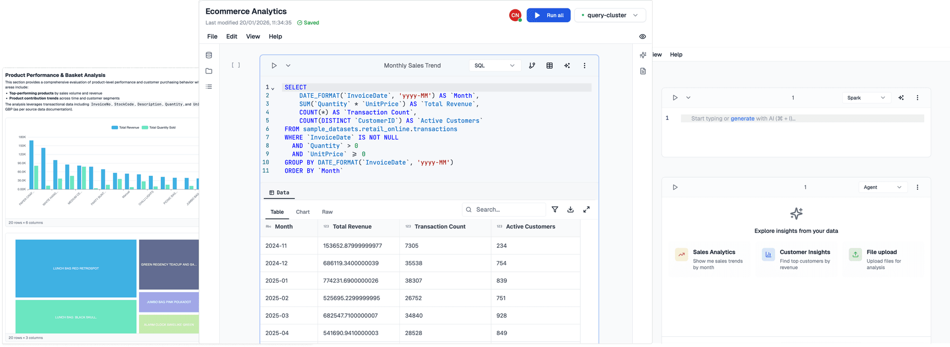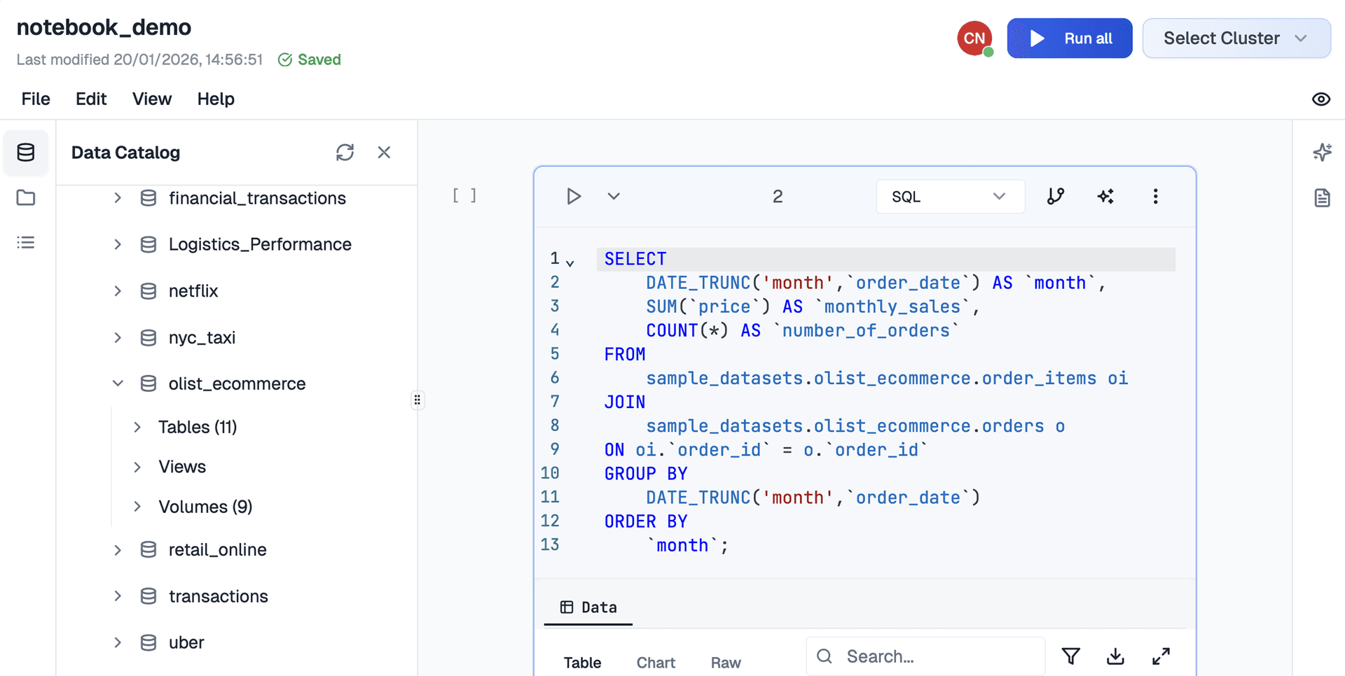 Our notebook supports multiple programming languages including Python, R, SQL, Scala, and JavaScript. You can mix languages within the same notebook, use SQL for data queries, and leverage our AI assistant for code generation and optimization across all supported languages.